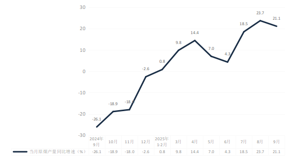 原煤生产保持较快增速。9月,规上工业原煤产量587.39万吨,同比增长21.1%,较上月增速回落2.6个百分点。日均原煤产量19.58万吨。