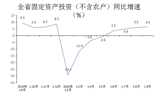 1-9月,全省固定资产投资同比增长6.5%,增速较1-8月回升0.5个百分点。其中,民间投资增长12.4%,增速较1-8月回落0.7个百分点,拉动全省投资增长5.3个百分点。