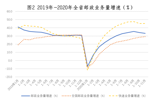 (四)邮政、电信业高位增长。疫情影响下,线上经济逆势增长,线下实体店积极拓展电商业务,带动全省邮政和电信业快速增长。邮政方面。1-11月,全省邮政业完成业务总量141.98亿元,同比增长33.3%,高于全国平均增速4.1个百分点。其中快递业务总量受疫情期间“同城配送”等快递服务增长的拉动,增速由1月的-11.9%增至1-11月的45.2%,高于全国1-11月增速14.7个百分点,成为支撑全省邮政业务发展的主要因素。电信方面。1-11月,全省电信业务总量5098.90亿元,同比增长34.4%,高于全国平均增速7.3个百分点,居全国第6位。11月当月,全省电信业务总量524.98亿元,同比增长38.7%,其中移动数据及互联网业务量504.5亿元,同比增长40.9%,占全部电信业务量的96.1%。移动互联网接入流量6.5亿GB,同比增长41.3%。