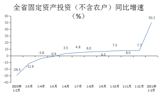 1-2月,全省固定资产投资同比增长50.2%,比2019年1-2月增长6.1%,两年平均增速为3.0%。其中,民间投资增长68.1%。