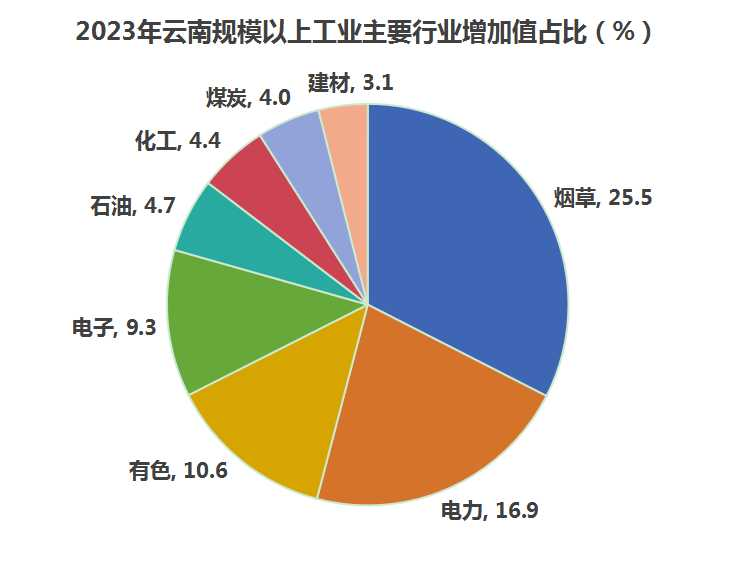 支柱行业稳步培育。2023年,烟草、电力、有色、电子四大支柱行业增加值占规模以上工业的比重合计达到62.3%。其中,电子行业继2021年首次跃升为全省第四大行业后,2023年发展动能持续壮大,规模以上企业数量由2012年末的10户增加到112户,增长10.2倍;增加值同比增长27.7%,占规模以上工业的比重达到9.3%,比2012年提升9.1个百分点,成为拉动全省规模以上工业增长的第一大行业。