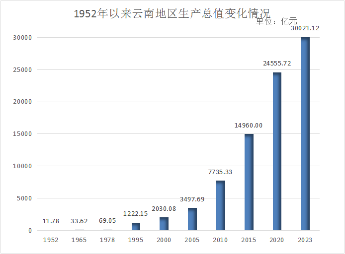 75年来,云南认真贯彻党中央决策部署,坚持走特色化产业发展道路,最大限度调动各族人民的积极性,实现了经济快速增长,总量从十亿级到万亿级的跨越。1952年-2023年,云南地区生产总值从11.78亿元增加到30021亿元,实际增长266倍,年均增长8.2%,比全国(7.9%)快0.3个百分点,总量稳定在全国18位,人均地区生产总值从70元增长到64107元,年均增长6.6%,实际提高95倍。