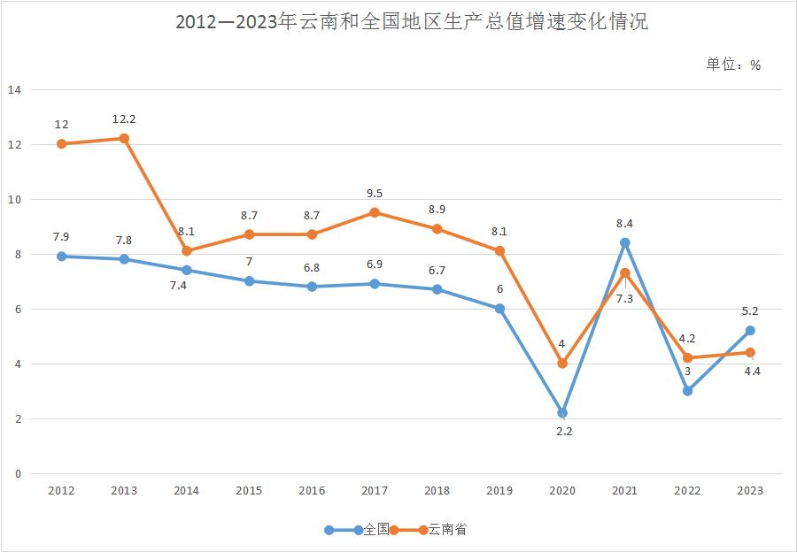 增速领先全国最快的时期。2013-2023年,云南地区生产总值年均增长7.6%,比全国(6.1%)快1.5个百分点,在全国排5位,11年间有5个年份排全国前3位,其中“十三五”期间增速达7.8%,比全国(5.7%)高2.1个百分点,排全国第3位,2018和2019年增速连续两年位居全国第2位,从历史脉络看,这是云南经济增速领先全国最多的时期。