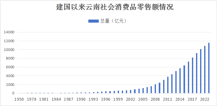 从消费规模看,社会消费品零售总额由1950年的3.83亿元增加到2023年的11560.68亿元,增长3018.5倍,年均增长11.6%。其中“一五”时期年均增长15.0%、“二五”时期年均增长3.1%、“三五”时期年均增长2.5%、“四五”时期年均增长8.0%、“五五”时期年均增长8.2%,“六五”时期年均增长17.3%,“七五”时期年均增长11.5%,“八五”时期年均增长20.5%,“九五”时期年均增长9.6%,“十五”时期年均增长12.3%,“十一五”时期年均增长19.7%,“十二五”时期年均增长14.8%,“十三五”时期年均增长10.2%。社会消费品零售总额占GDP的比重从2012年的34.9%上升到2023年的38.5%,提高3.6个百分点。新中国成立以来,云南省社会消费品零售总额突破百亿规模用了38年,突破千亿规模用了17年,突破万亿规模用了15年,我们坚定不移实施改革开放战略,前进的步伐越迈越快、越迈越稳。