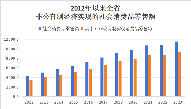 随着改革开放战略的持续实施,市场经济发展日新月异,市场主体多元化日益显著,非公有制经济已成为市场发展的主体,其经营方式灵活、适应能力强等优势不断显现,成为消费品市场持续发展的主要力量。2023年,全省非公有制经济实现消费品零售额9370.47亿元,占社会消费品零售总额的比重为81.1%,非公有制经济实现消费品零售额逐年快速增长,比2000年增长25.6倍,年均增长15.3%;是2012年的2.64倍,年均增长9.2%。非公有制经济在全省消费品零售市场占八成以上,对消费市场的稳步增长发挥了积极有力的促进作用。