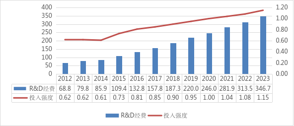 (二)企业对研发创新重视程度提升。规模以上工业企业R&D经费支出从2012年的38.44亿元增长到2023年的210.15亿元,年均增长16.7%。投入强度(R&D经费与营业收入或主营业务收入之比)从0.43%提高到1.05%,提高0.62个百分点。规模以上工业企业创新费用支出从2016年的147.91亿元增长到2023年的320.56亿元,年均增长8.97%。