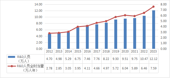 (三)科技人才队伍发展壮大。全省R&D人员从2012年的4.70万人增加到2023年的12.12万人,年均增长9.0%。R&D人员折合全时当量从27817.2人年增长到75858.8人年,年均增长9.5%。在人才引进方面,形成了包括院士自由探索、省科技领军人才培养、省创新团队培育、省“两类”人才培养,以及省高层次人才、省高端外国专家、省高层次创新团队引进,院士专家工作站建设,“智汇云南”计划实施等衔接有序、梯次配备的科技人才及创新团队培养引进计划体系。连续4个院士增选年,共有 10 名科技人才当选“两院”院士,在滇“两院”院士达15人。