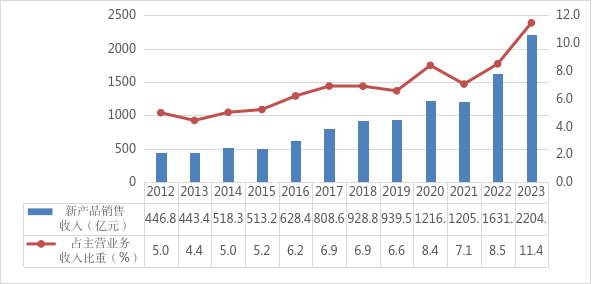 (一)新产品销售收入对企业收入的贡献加大。规模以上工业企业的新产品开发项目数从2012年的1512项增加到2023年的7108项,年均增长15.1%,新产品开发经费支出从39.63亿元增加到187.23亿元,年均增长15.2%,新产品销售收入从446.82亿元增长到了2204.59亿元,年均增长15.6%,新产品销售收入占主营业务收入的比重从5.0%提高到了11.4%,年均提高0.58个百分点。