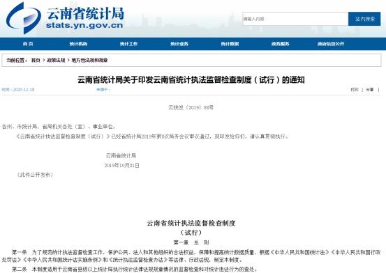 为进一步规范我省统计执法监督检查工作,保护公民、法人和其他组织的合法权益,保障和提高统计数据质量,省统计局制定了《 云南省统计执法监督检查制度(试行) 》于 2019年10月21日正式印发 各州(市)统计局、省局机关各处(室)、事业单位贯彻执行。现对 制订的主要内容和特点 进行解读。