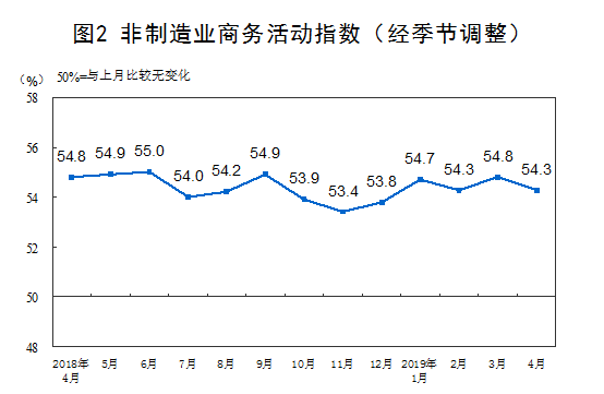 2019 年 4 月份,中国非制造业商务活动指数为 54.3% ,比上月回落 0.5 个百分点,但仍位于较高扩张区间,表明非制造业总体保持较快增长态势。