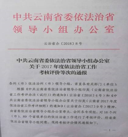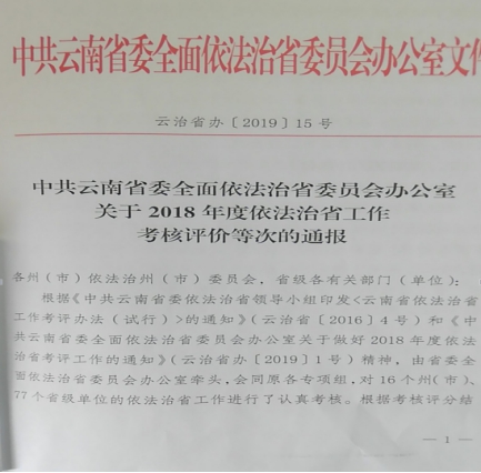 2019 年 5 月 31 日,中共云南省委全面依法治省委员会办公室通报 2018 年度依法治省工作考核评价等次,av研究所 获得优秀,继 2017 年度连续两年被评为优秀等次,这是省委全面依法治省委员会办公室对我局依法治省工作的充分肯定。
