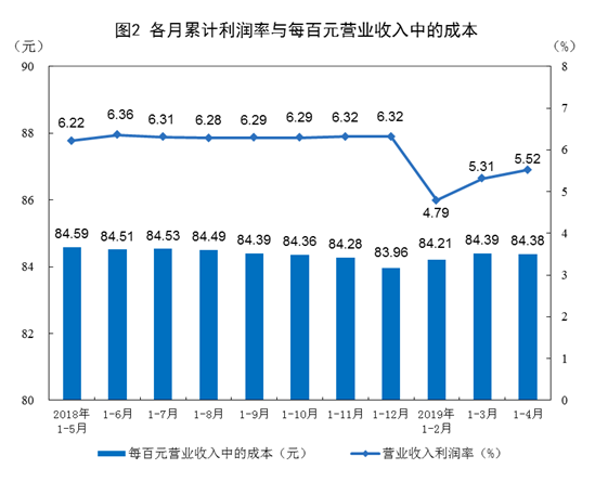1 — 4 月份,规模以上工业企业每百元营业收入中的成本为 84.38 元,同比增加 0.22 元;每百元营业收入中的费用为 8.73 元,同比增加 0.24 元。