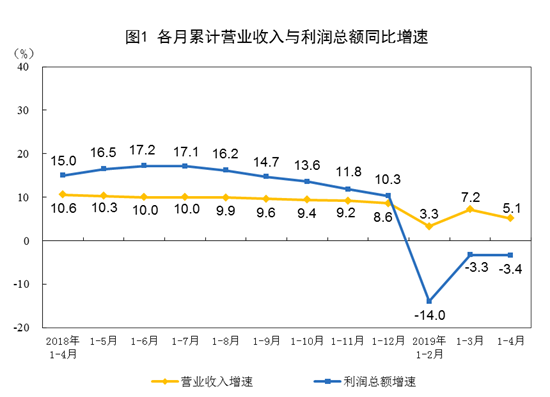 1 — 4 月份,规模以上工业企业实现营业收入 32.84 万亿元,同比增长 5.1% ;发生营业成本 27.71 万亿元,增长 5.3% ;营业收入利润率为 5.52% ,同比降低 0.48 个百分点。
