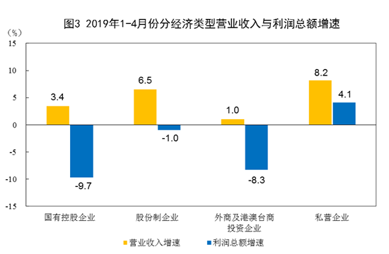 1 — 4 月份,规模以上工业企业中,国有控股企业实现利润总额 5704.3 亿元,同比下降 9.7% ;股份制企业实现利润总额 12873.3 亿元,下降 1.0% ;外商及港澳台商投资企业实现利润总额 4455.2 亿元,下降 8.3% ;私营企业实现利润总额 4597.1 亿元,增长 4.1% 。