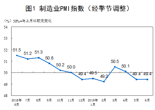 2019 年 6 月份,中国制造业采购经理指数( PMI )为 49.4% ,与上月持平。