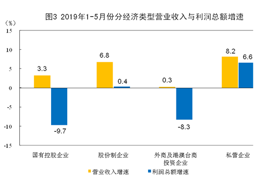 1 — 5 月份,规模以上工业企业中,国有控股企业实现利润总额 7342.3 亿元,同比下降 9.7% ;股份制企业实现利润总额 16993.1 亿元,增长 0.4% ;外商及港澳台商投资企业实现利润总额 5775.8 亿元,下降 8.3% ;私营企业实现利润总额 6072.7 亿元,增长 6.6% 。