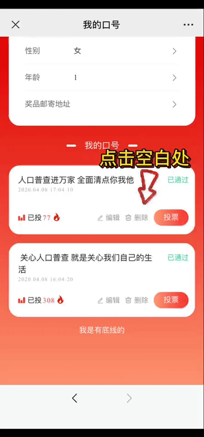 查看自己的口号详情。口号可编辑、可删除;每人每天可投