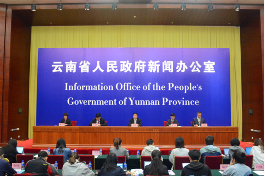 云南省人民政府新闻办公室对外新闻处副处长宗霞主持新闻发布会 ( 记者 赵嘉 摄影 )