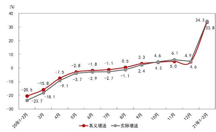 市场销售持续回升。我国统筹疫情防控和经济社会发展取得重大成果,经济运行稳定恢复,消费市场延续了上年持续复苏的良好态势。2021年1—2月份,受同期基数较低影响,消费市场同比增速较高,社会消费品零售总额同比增长33.8%,扣除价格因素,实际增长34.3%。与2019年1—2月份相比,社会消费品零售总额增长6.4%,两年平均增速(是指以2019年1—2月份为基期,采用几何平均的方法计算的增速)为3.2%。