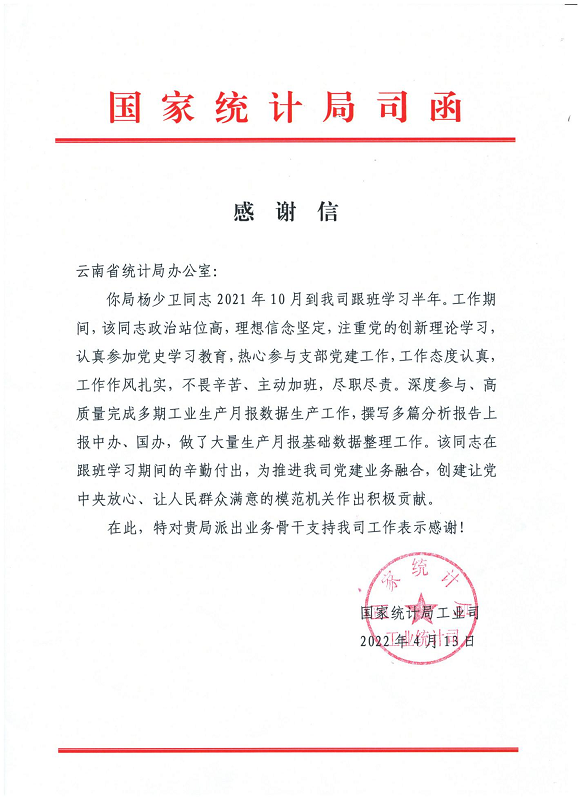 近日,国家统计局工业司就我局工业处选派业务骨干跟班学习发来感谢信,自2020年12月起,我局工业处先后派出徐薇薇、杨少卫两位同志到国家统计局工业司跟班学习,工业司对两位同志借调期间的工作给予了充分肯定,对我局给予工业统计工作的大力支持表示衷心感谢。