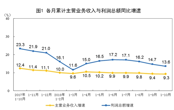 1-10 月份,全国规模以上工业企业实现利润总额 55211.8 亿元,同比增长 13.6% (按可比口径计算,考虑统计制度规定的口径调整、统计执法增强、剔除重复数据、企业改革剥离等因素影响,详见附注二),增速比 1-9 月份放缓 1.1 个百分点。