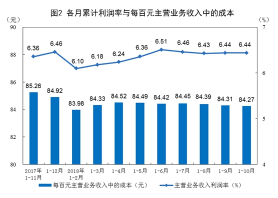 1-10 月份,规模以上工业企业实现主营业务收入 85.7 万亿元,同比增长 9.3% ;发生主营业务成本 72.2 万亿元,增长 9% ;主营业务收入利润率为 6.44% ,同比提高 0.24 个百分点。