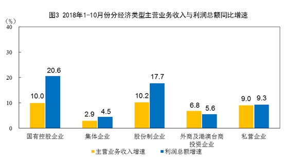 1-10 月份,规模以上工业企业中,国有控股企业实现利润总额 16724 亿元,同比增长 20.6% ;集体企业实现利润总额 167.7 亿元,增长 4.5% ;股份制企业实现利润总额 38978.4 亿元,增长 17.7% ;外商及港澳台商投资企业实现利润总额 13802 亿元,增长 5.6% ;私营企业实现利润总额 14131.6 亿元,增长 9.3% 。