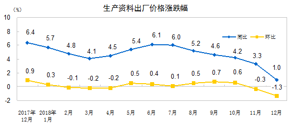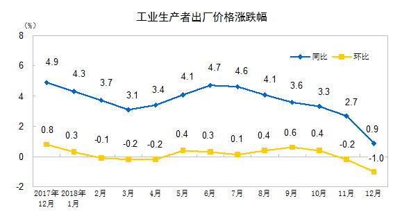 2018 年 12 月份,全国工业生产者出厂价格同比上涨 0.9% ,环比下降 1.0% ;工业生产者购进价格同比上涨 1.6% ,环比下降 0.9% 。全年工业生产者出厂价格比上年上涨 3.5% ,工业生产者购进价格上涨 4.1% 。