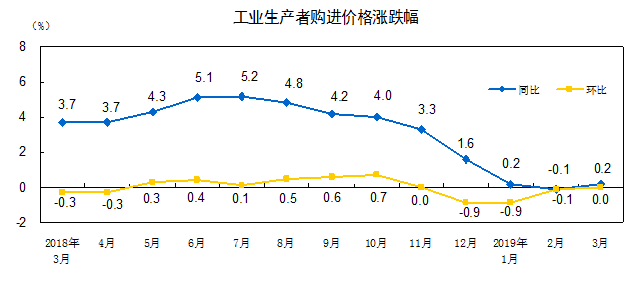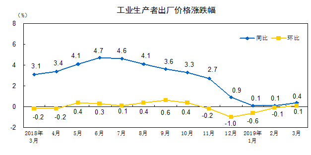 2019 年 3 月份,全国工业生产者出厂价格同比上涨 0.4% ,环比上涨 0.1% ;工业生产者购进价格同比上涨 0.2% ,环比持平。一季度,工业生产者出厂价格比去年同期上涨 0.2% ,工业生产者购进价格上涨 0.1% 。