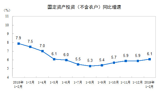 2019 年 1-2 月份,全国固定资产投资(不含农户) 44849 亿元,同比增长 6.1% ,增速比 2018 年全年提高 0.2 个百分点。从环比速度看, 2 月份固定资产投资(不含农户)增长 0.43% 。其中,民间固定资产投资 26963 亿元,同比增长 7.5% 。