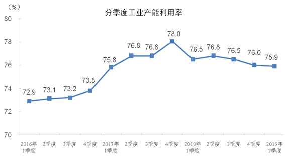 2019 年一季度,全国工业产能利用率为 75.9% ,比上年同期下降 0.6 个百分点。