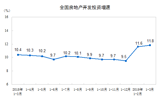 2019 年 1-3 月份,全国房地产开发投资 23803 亿元,同比增长 11.8% ,增速比 1-2 月份提高 0.2 个百分点。其中,住宅投资 17256 亿元,增长 17.3% ,增速回落 0.7 个百分点。住宅投资占房地产开发投资的比重为 72.5% 。