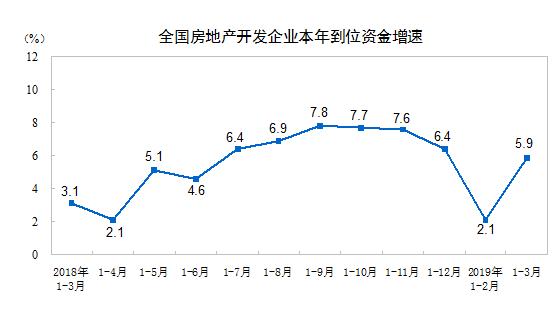 1-3 月份,房地产开发企业到位资金 38948 亿元,同比增长 5.9% ,增速比 1-2 月份提高 3.8 个百分点。其中,国内贷款 7134 亿元,增长 2.5% ;利用外资 33 亿元,增长 1.1 倍;自筹资金 11795 亿元,增长 3.0% ;定金及预收款 12303 亿元,增长 10.5% ;个人按揭贷款 5645 亿元,增长 9.4% 。