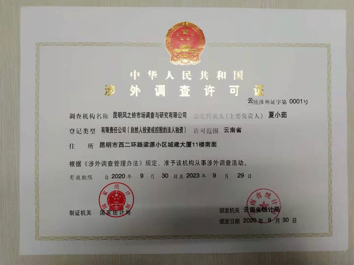 昆明风之铃市场调查与研究有限公司取得涉外调查许可证(云统涉外证字第0001号)