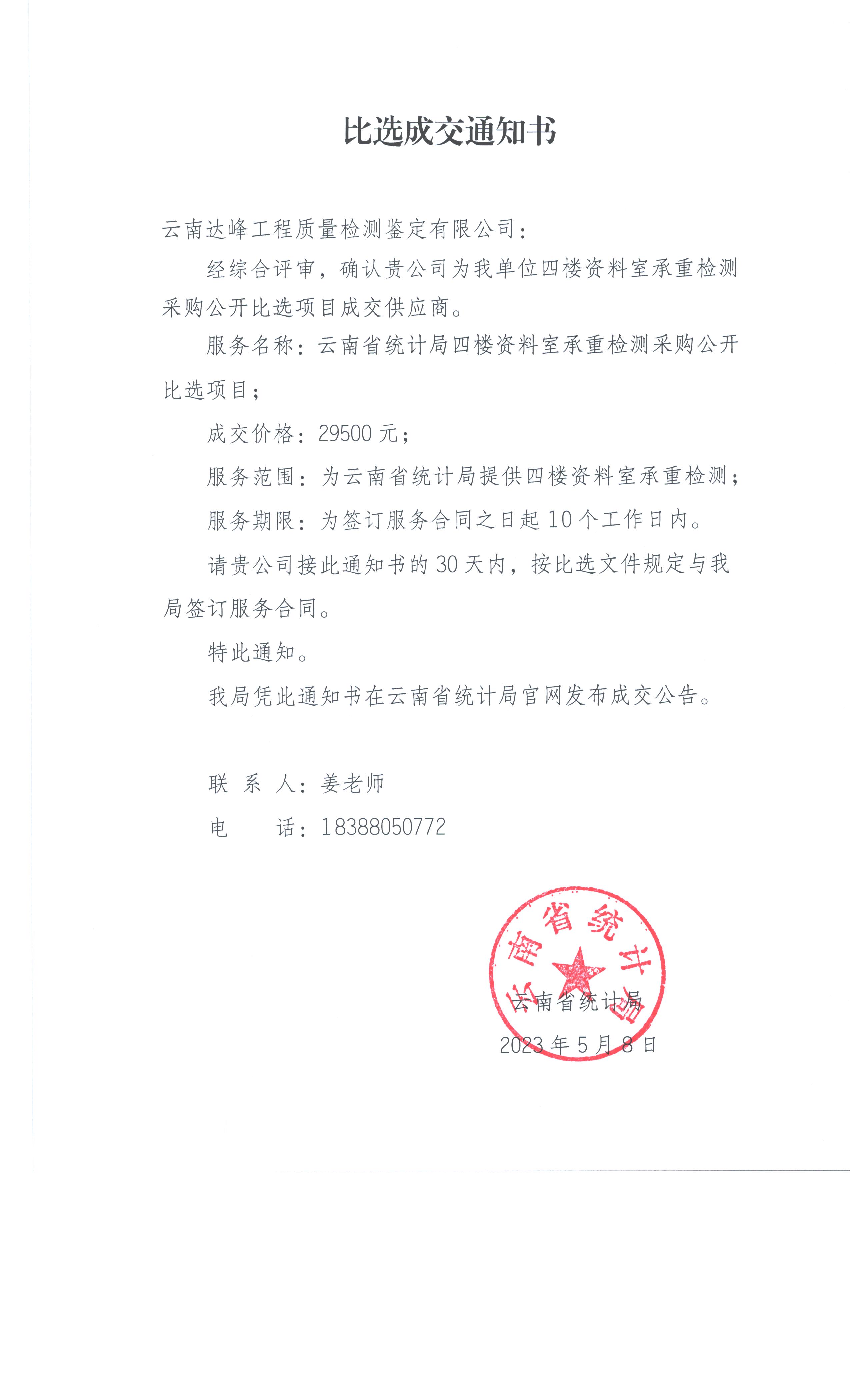 名称:av研究所 四楼资料室承重检测供货服务 服务范围:为av研究所 四楼资料室提供承重检测服务 服务要求: 符合国家、 地方 、行业现行相关标准,满足采购人需求 服务时间: 签订供货协议之日起至 10个工作日内 成交价格: 29500元