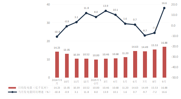 电力生产增速回升。9月,规上工业发电量506.34亿千瓦时,同比增长16.6%,较上月增速提高23.8个百分点。日均发电量16.88亿千瓦时。