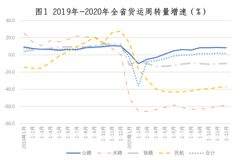 (一)运力回升,货运较快恢复。2020年年初,为迅速阻断疫情蔓延,各地均采取了严格的交通管制措施,短时间内对交通运输业产生重大影响,1-2月,全省货运量同比下降31.1%。货物运输由于其刚性需求和对生产发展的不可替代性,在复工复产后快速恢复。货运量增速从1-2月的-31.1%提升至全年的-1.3%,回升29.8个百分点;货运周转量从1-2月的-35.9%提升至全年的1.8%,回升37.7个百分点。分运输方式看,铁路和公路的货运恢复速度快于水路和民航,其中公路货运恢复最为迅速,公路货运量自1-2月降至谷底以来,增速不断提升,1-7月扭负为正,目前基本恢复至上年同期水平;公路货运周转量1-5月转正,全年增速8.5%。公路货运已超过全省货运六成的占比,持续推动全省交通运输平稳发展,为社会生产和生活提供了有力的运输服务保障。