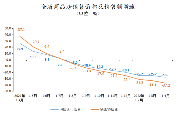 1-4月,全省商品房销售面积895.38万平方米,同比下降27.9%,其中,住宅销售面积下降27.5%;商品房销售额631.85亿元,下降37.2%,其中,住宅销售额下降37.0%。