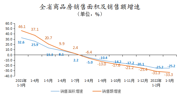 1-3月,全省商品房销售面积692.84万平方米,同比下降25.2%,其中,住宅销售面积下降25.1%;商品房销售额488.58亿元,下降33.3%,其中,住宅销售额下降33.1%。