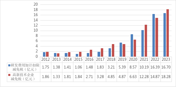 (四)税收减免政策支持力度不断加强。研发费用加计扣除减免税、高新技术企业减免税等政策的不断完善,对落实创新驱动发展战略、促进产业升级发挥了积极作用。云南省规模以上工业企业享受研发费用加计扣除减免税从2012年的1.75亿元增加到2023年的16.70亿元,年均增长22.7%;高新技术企业减免税从1.86亿元增长到18.28亿元,年均增长23.1%。