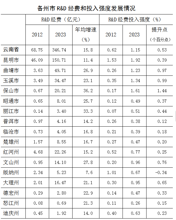 3.分州(市)看,云南省16个州(市)除了版纳州以外,R&D经费支出年均增速均达到两位数,其中:曲靖市、玉溪市、保山市、昭通市、丽江市、文山州、大理州、德宏州和怒江州9个州市的年均增长速度超过了20%。(详见附表)