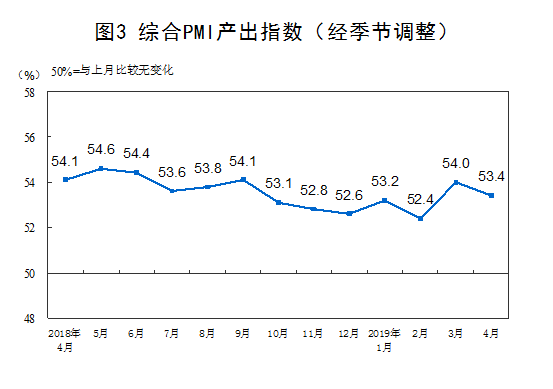 2019 年 4 月份,综合 PMI 产出指数为 53.4% ,比上月回落 0.6 个百分点,表明我国企业生产经营活动总体继续扩张,但步伐有所放缓。
