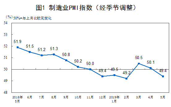 2019 年 5 月份,中国制造业采购经理指数( PMI )为 49.4% ,比上月回落 0.7 个百分点。