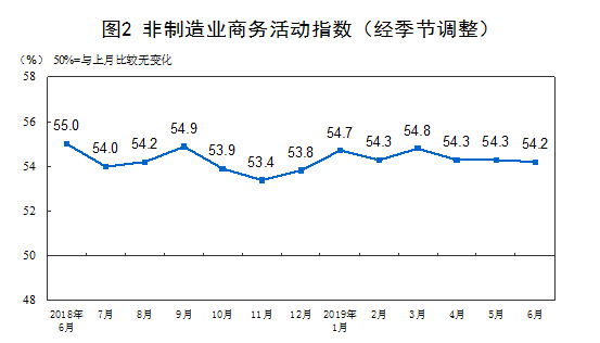 2019 年 6 月份,中国非制造业商务活动指数为 54.2% ,比上月微落 0.1 个百分点,继续位于扩张区间。