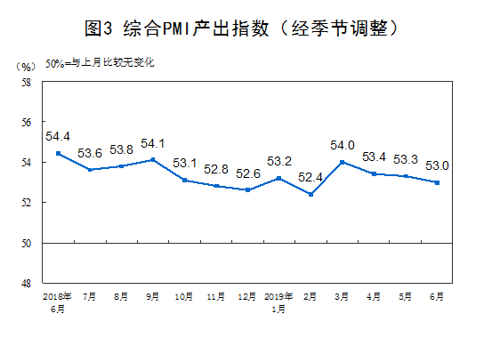 2019 年 6 月份,综合 PMI 产出指数为 53.0% ,比上月回落 0.3 个百分点,表明我国企业生产经营活动保持扩张,但步伐有所放缓。