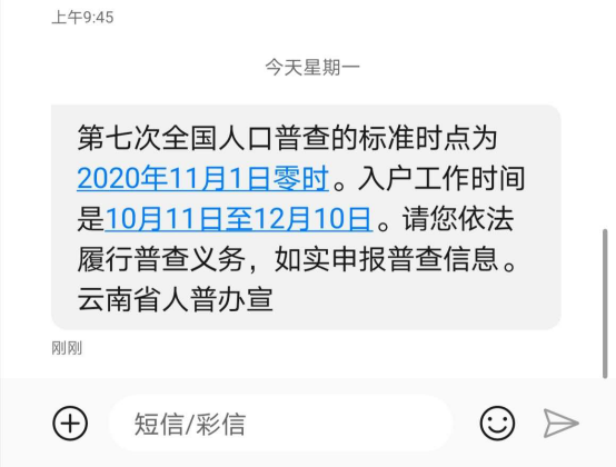 10月11日至10月31日期间,云南省全面开展第七次全国人口普查摸底工作。为切实做好云南省第七次全国人口普查社会动员和宣传工作,引导每一个公民积极支持、配合人口普查,云南省人普办、省委宣传部联合省通信管理局聚力云南移动、云南电信和云南联通,对全省五千多万手机用户发送了人口普查公益宣传短信,全面提升普查知晓率,为普查工作顺利实施创造良好的舆论氛围。