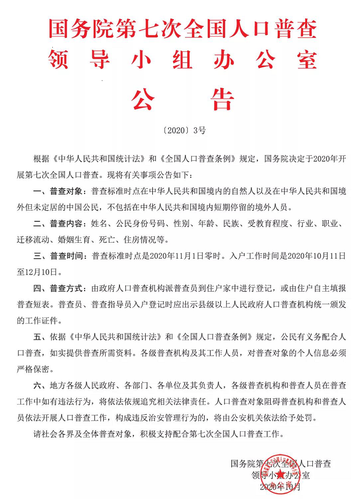 国务院第七次全国人口普查领导小组办公室公告
