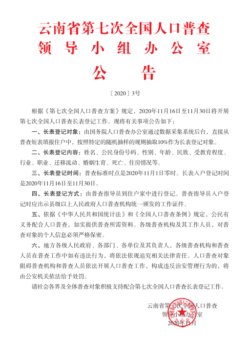 云南省第七次全国人口普查领导小组办公室公告