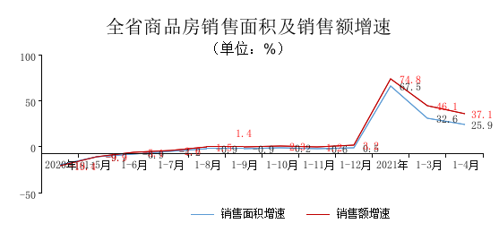 1-4 月 , 商品房销售面积 1241.08 万平方米 , 同比增长 25.9 % ; 比 2019 年 1-4 月增长 3.2%, 两年平均增长 1.6% 。 其中 , 住宅销售面积同比增长 21.2 %, 办公楼销售面积同比增长 108.5 %, 商业营业用房销售面积同比增长 45.8 %。 商品房销售额 1005.99 亿元 , 同比增长 37.1 % ; 比 2019 年 1-4 月增长 10.5%, 两年平均增长 5.1% 。 其中 , 住宅销售额同比增长 35.2 %, 办公楼销售额同比增长 50.2 %, 商业营业用房销售额同比增长 44.2 %。