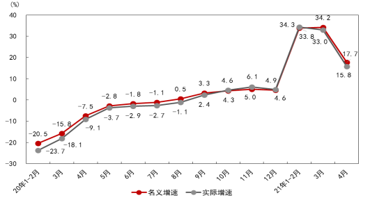 餐饮、旅游等服务消费保持复苏。餐饮消费方面,4月份,餐饮收入同比增长46.4%,增速比3月份回落45.2个百分点,主要是同期基数变化影响。2020年4月份餐饮收入降幅比3月份大幅收窄,影响今年4月份增速回落超过40个百分点。与疫情前2019年同期相比,4月份餐饮收入增长0.8%,而一季度餐饮收入下降2%。总体来看,餐饮消费持续恢复。旅游消费方面,清明节假期,全国国内旅游出游人次超过1亿,按可比口径同比增长144.6%,恢复至疫情前同期的94.5%,旅游需求明显释放。